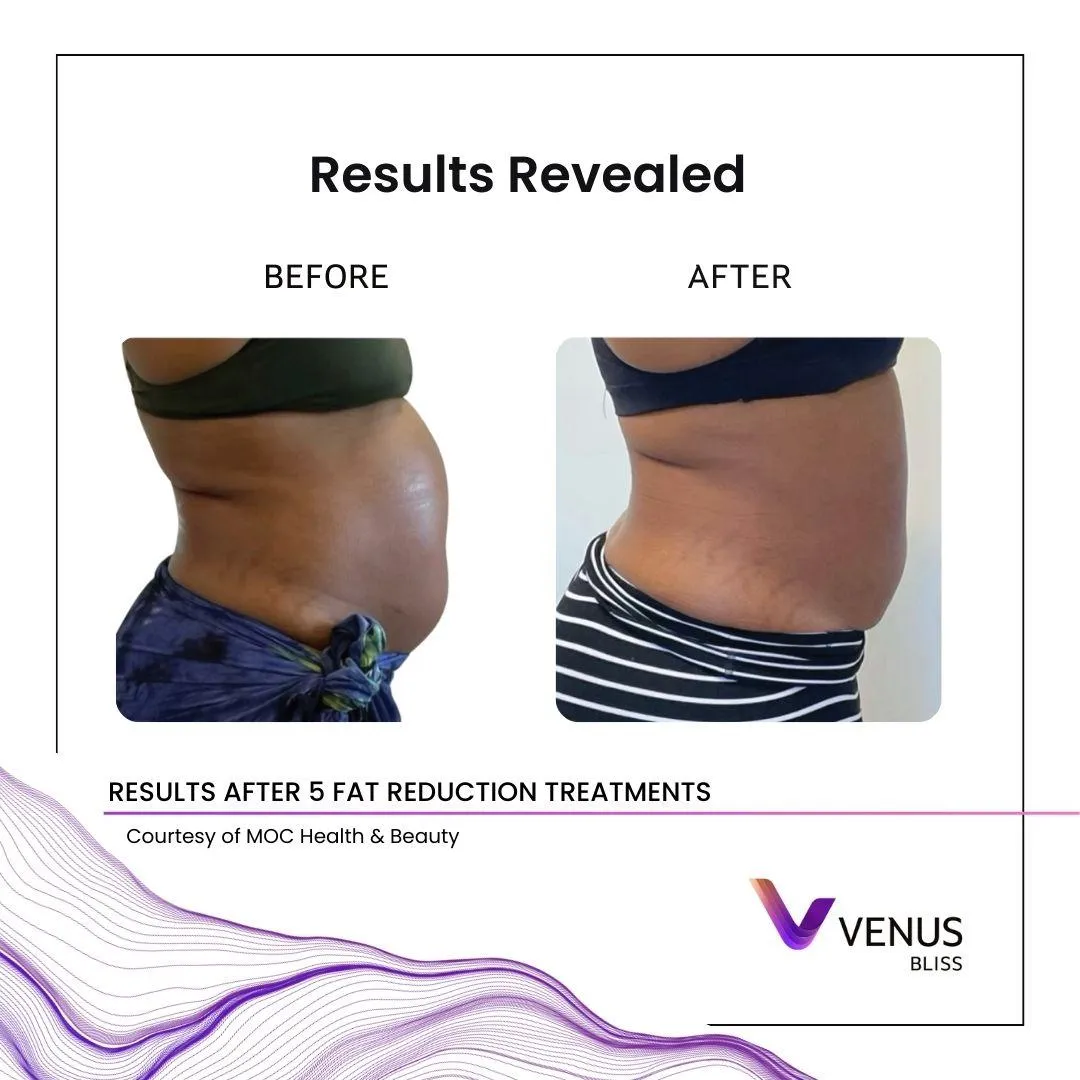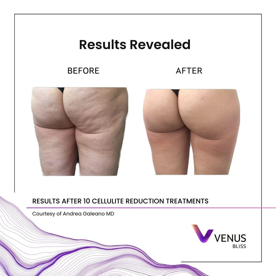 Venus Bliss is a non-invasive body contouring treatment that targets stubborn fat, reduces circumference, and smooths the appearance of cellulite using diode laser and (optional) complementary skin-tightening technology.
